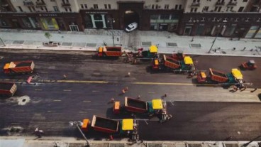 A time-lapse shows a construction crew and hundreds of machines working on a long stretch of road...