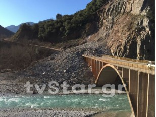A landslide in the area of Dipotama, Karpenisi, Greece cuts the local road network in two, for a sec...