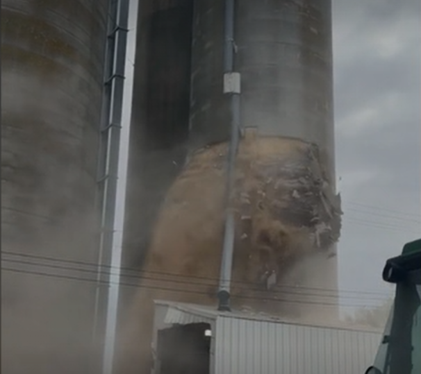A concrete grain silo at an agricultural cooperative facility collapsed, spilling an estimated 30,000 bushels of soybeans and causing significant local disruption. The structural failure occurred shortly after emergency personnel identified a critical warning sign.