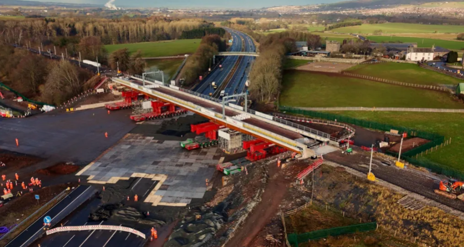 The bridge installation was completed during a second planned closure between junctions 39 and 40 of the M6. The operation involved more than 600 wheeled axles and a coordinated lifting and sliding sequence to position the bridge onto its permanent bearings.