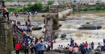 A decades-old iron bridge spanning the Indrayani River in the Kundmala area of Pune, Maharashtra, c...
