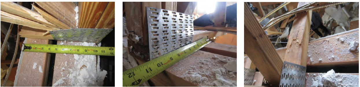 The collapsed floor was supported by 24-inch-deep metal plate connected wood trusses, spaced 16 inches on center, with a span of about 20 feet-9 inches. The truss failures were predominantly at the end intersecting with the stair wall. Despite these failures, the truss bottom chords in the center span were intact, and the metal truss plates were fully embedded, indicating a failure not due to the trusses' inability to handle the design load.