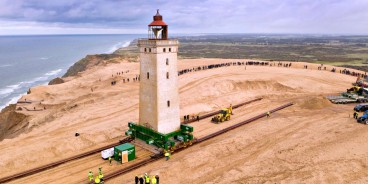 Rubjerg Knude lighthouse, located in Hjorring, northwest Denmark, was moved from an eroding sand dune cliff. The 120-year old structure was situated Rubjerg Knude lighthouse, located in Hjorring, no...