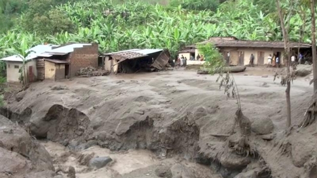 Heavy rainfall caused a river to burst its bank triggering a landslide that struck many houses in Uganda's mountainous town of Bukalasi. Heavy rainfall caused a river to burst its bank triggering a l...