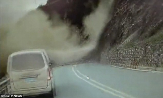 Motorists in the Yunnan Province in southern China narrowly avoided being buried or swept off the road by a landslide on Wednesday. The driver noticed a disturbance upon the slope above while driving...