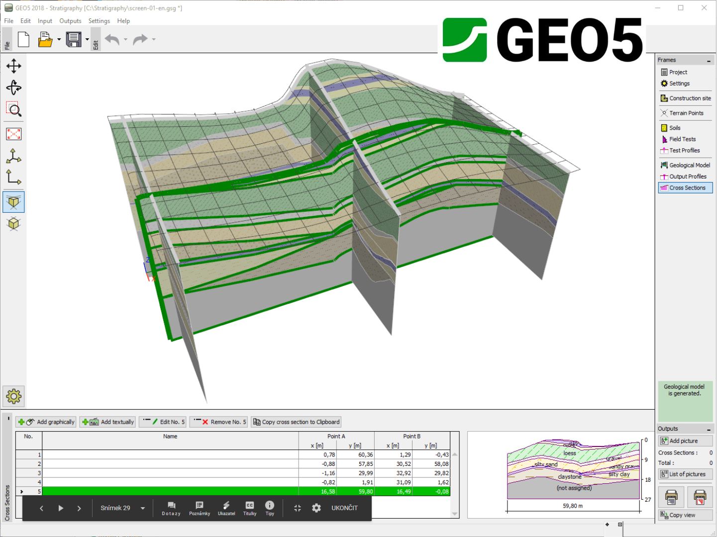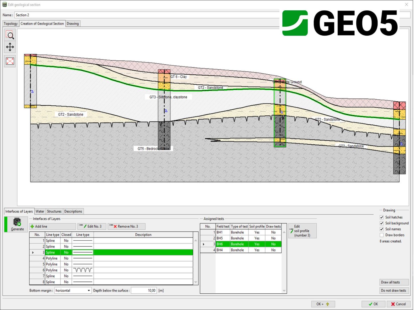 The GEO5 Stratigraphy program is designed to process results from site investigation (boreholes, wells, CPTs, DPTs, SPTs, DMTs ...), generate 2D or 3D geological models and export cross sections and g...